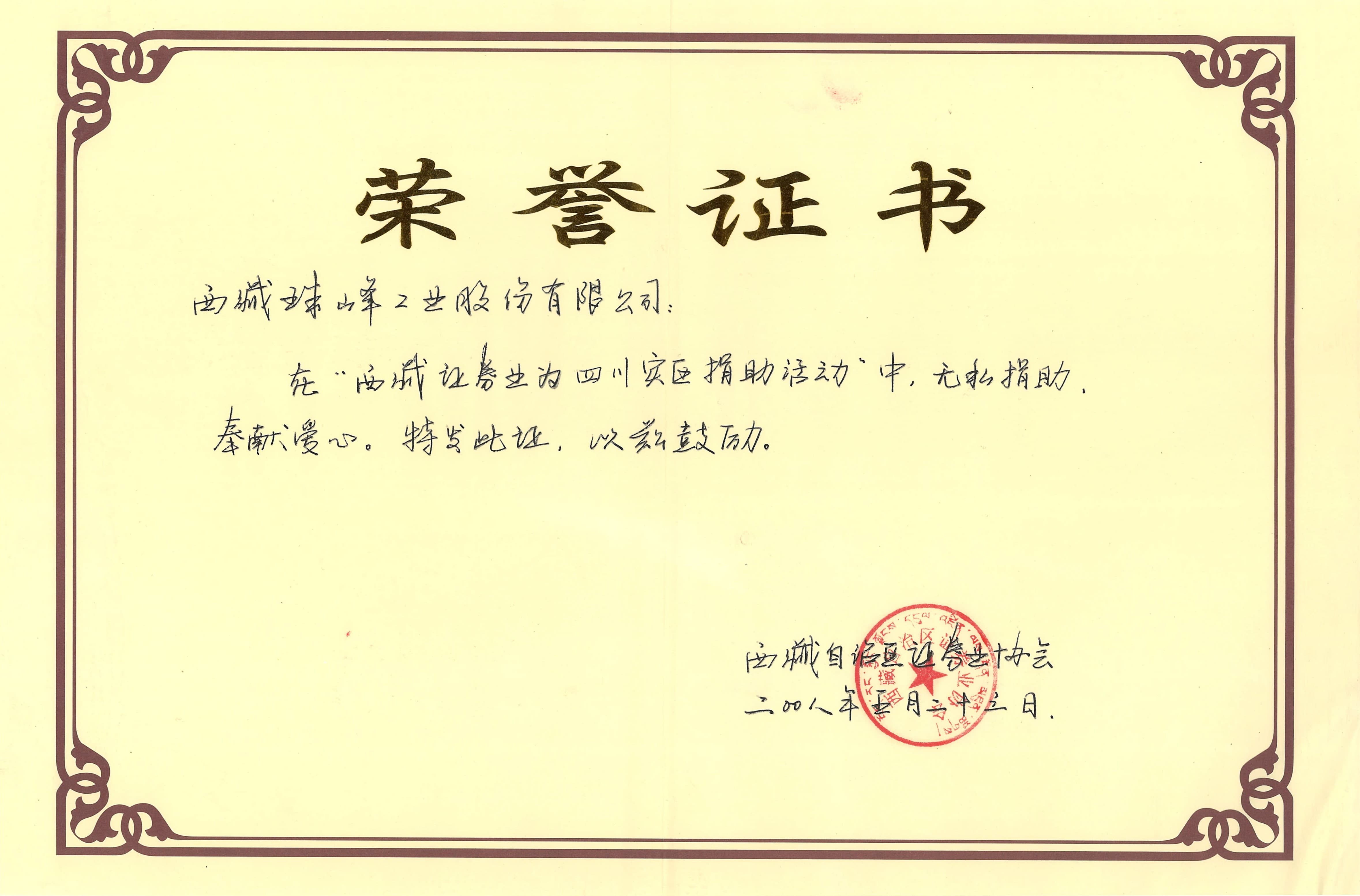 四川災(zāi)區(qū)捐助活動榮譽證書